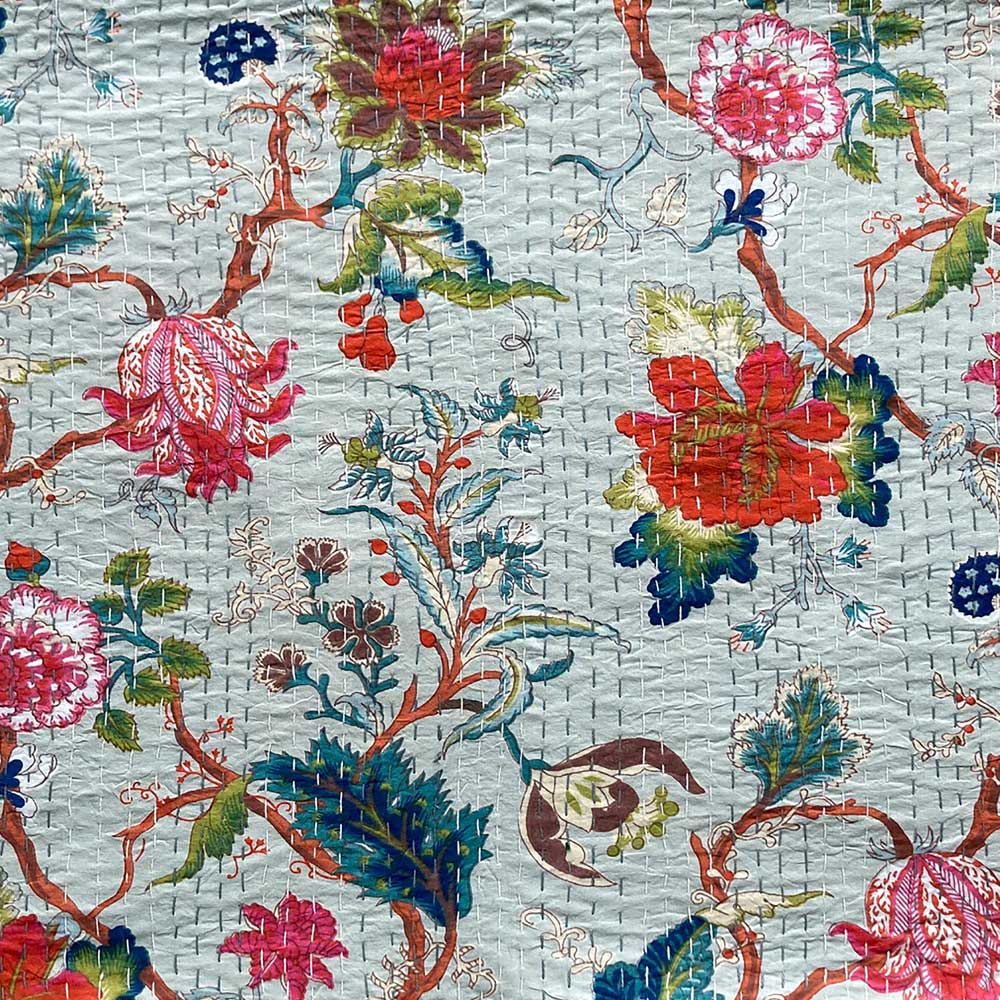 Our range of throws uses the technique of ‘Kantha’ – a running stitch, one of the oldest forms of traditional embroidery. These throw are 100% printed cotton with a self—coloured backing and are embellished with lines of running stitches. A standard blanket double, they are perfect for sofas or as bedspreads, bringing an injection of colour, print and texture to a room.