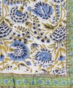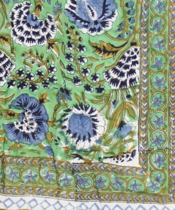 This stunning emerald green and blue quilt/throw has a rich all-over print of blue and olive flowers against a white background with contrasting emerald green trims running around the edge of the quilt. The back of the quilt has the same design but the colours are slightly different, the background is the luscious green and the flowers are blue with white detailing making the quilt double-sided.