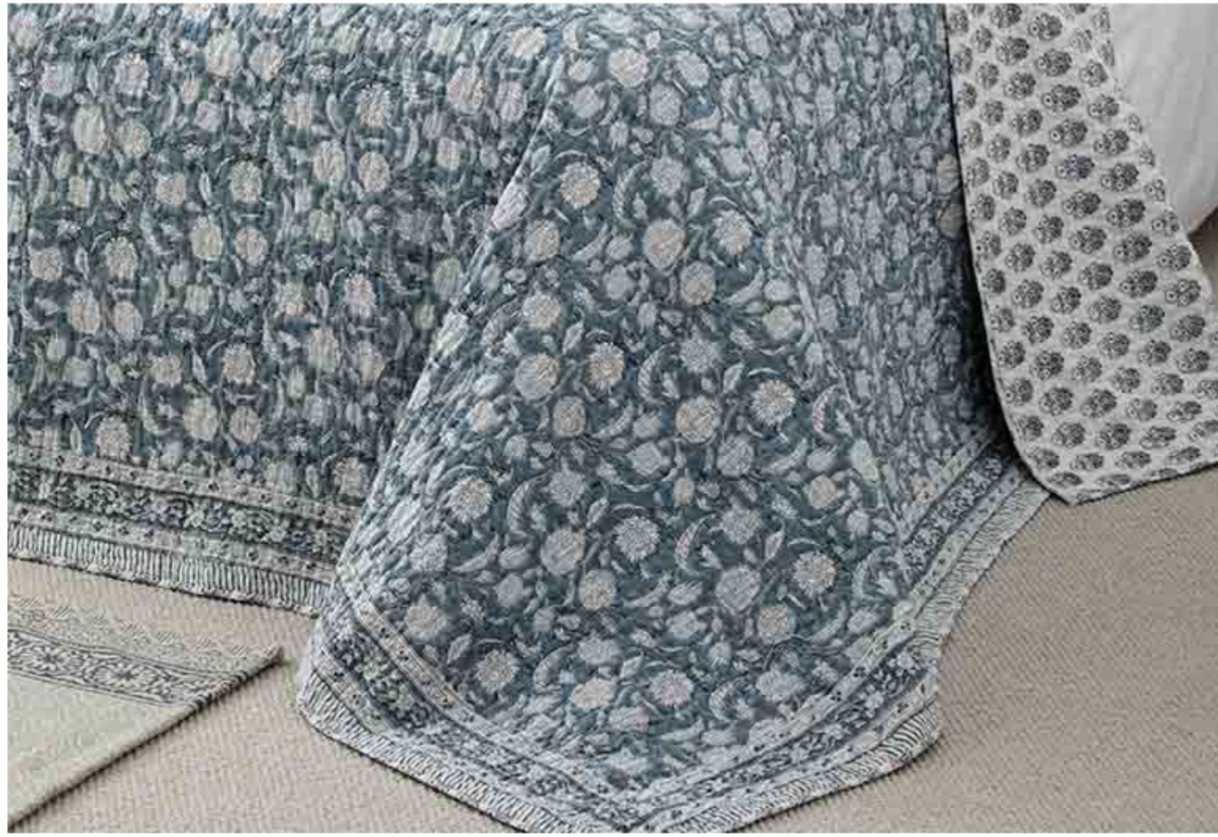 This quilted bedspread has been hand block printed by skilled artisans using hand carved wooden blocks that give each piece unique characteristics.  The bedspread is then finished with hand worked kantha stitching.