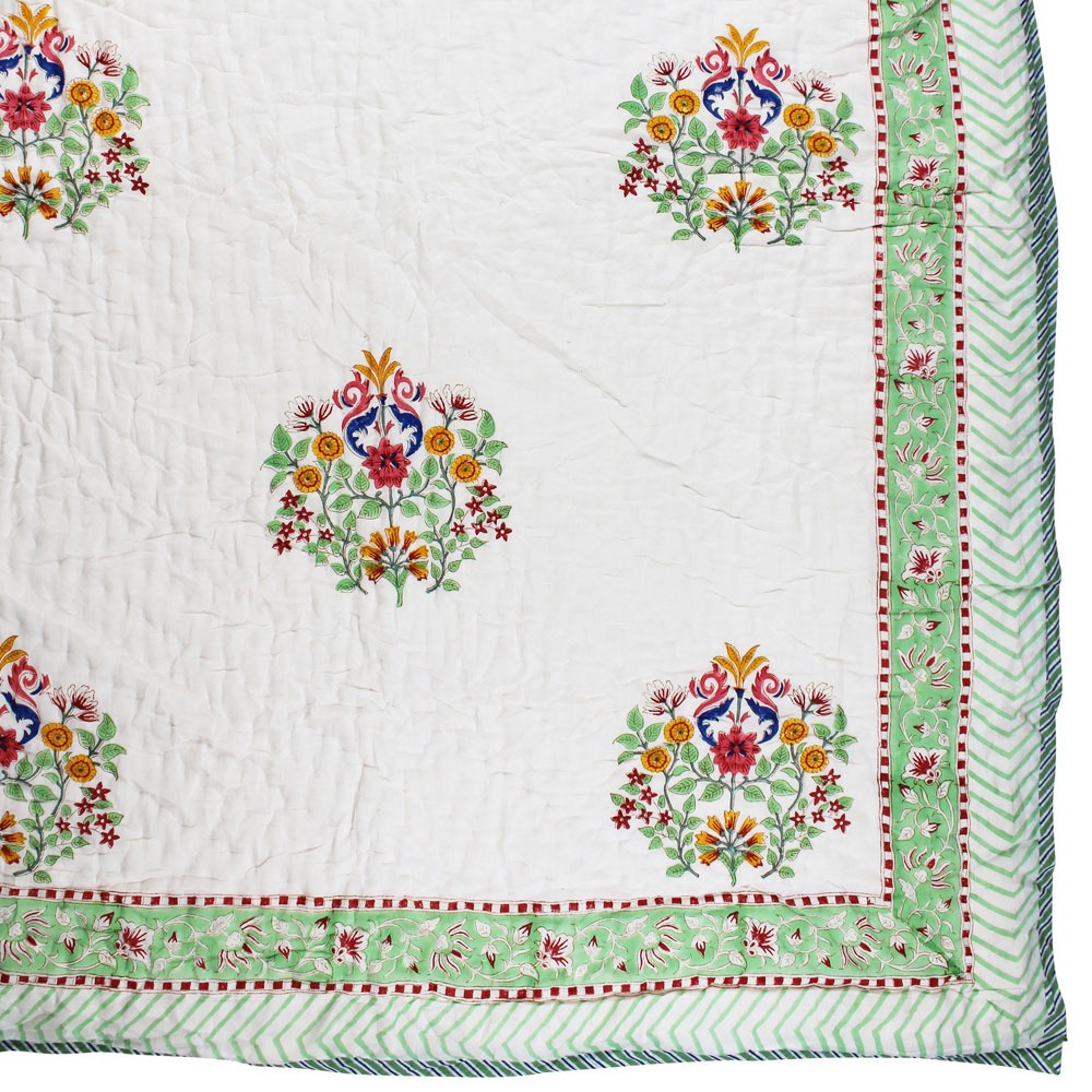 This gorgeous double sided cotton filled quilt has a large colourful block print design in pinks, greens, oranges and blues, with detailed floral and striped trims around the edge. On the reverse side of the quilt a pretty pink and sage all over floral print with a thin band of stripy green trim.