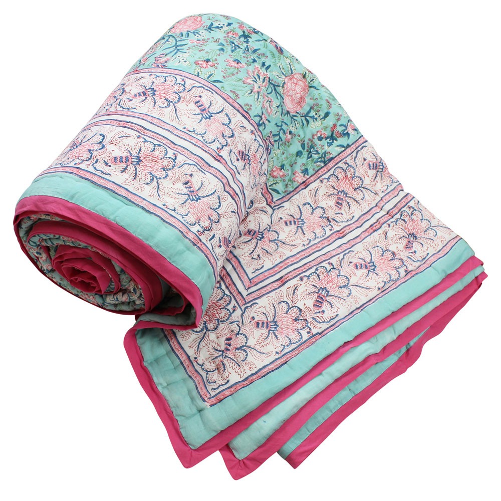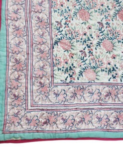 This stunning pale turquoise floral printed quilt/throw has a feminine all-over print of pink, navy and white flowers against a pale turquoise background with contrasting hot pink trim running around the edge of the quilt. The back of the quilt has the same design but the colours are reversed, the background is white with the pink and blue flowers making the quilt double-sided.