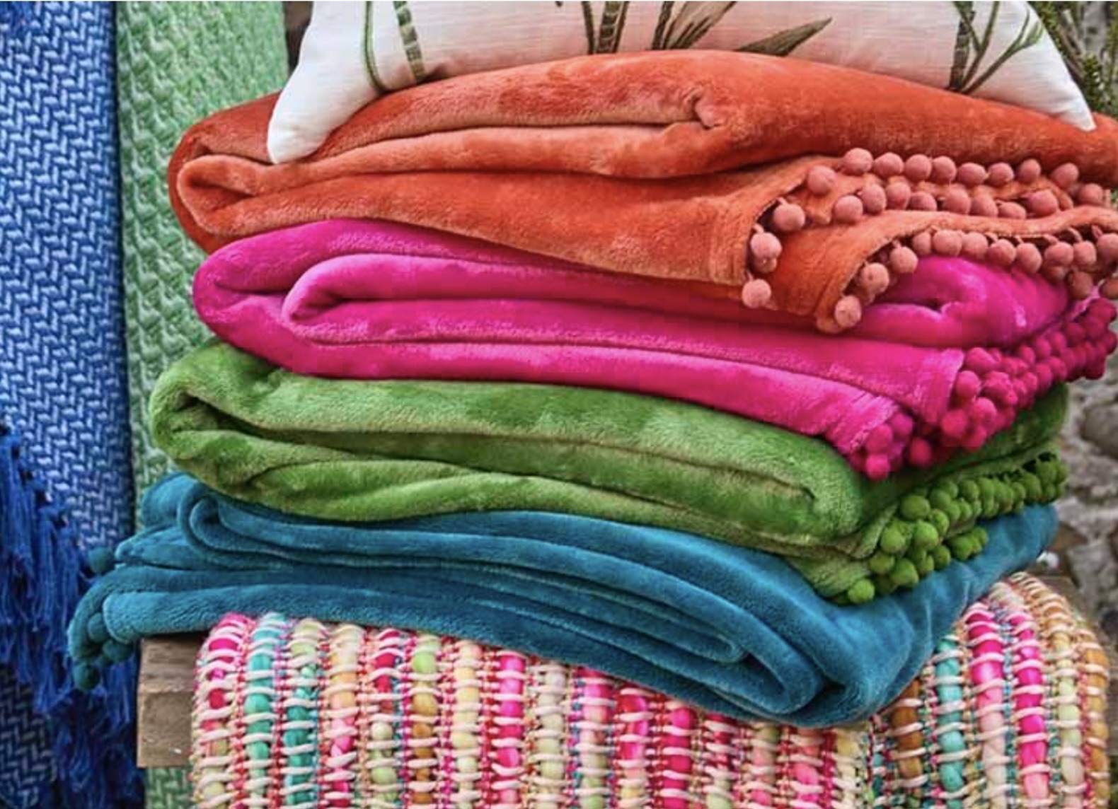 Faux Fur and fleece throws are a must-have – they are wonderful to wrap in on the sofa or as an extra bed throw especially when the weather is cold and uninviting outside!!