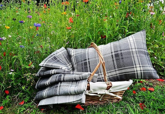Our Angus design is a traditional Harris Tweed plaid inspired by the Scottish highlands on a flat woven polycotton fabric. Angus is available in 5 modern colours – Duck Egg Blue, Red and White, Purple and Green, Natural Beige and Charcoal Grey. Each check pattern features rustic dark grey, white and brown stripes. Suitable for farmhouse, countryside and contemporary room schemes, this shabby chic style combines well with plain, semi-plain and printed fabrics. Nb any product in this range measuring over 130cms in the fabric width is seemed which allows for the wide variety of sizes available – simply choose the throw, bedspread, bed runner/table runner to suit from the drop down options menu and add to your check out basket