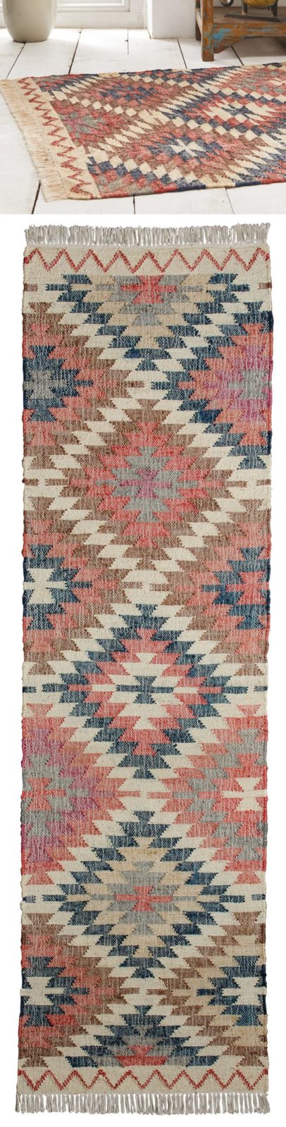 Skilfully handspun on a traditional loom, natural jute is woven into a beautiful, richly toned kilim  rugs and runners. Jute is fast growing and does minimal damage to the environment. The bold geometric design is striking in its simplicity and full of character. This is a truly eco friendly piece, made from sustainable material and produced using a manual pollution free method.