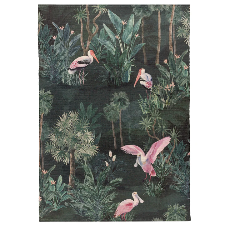 The exotic indoor/outdoor rug and cushion range exudes laid back tranquility. A digitally printed design featuring Spoonbill birds grazing in the tropical jungle on a bottle green background is perfect to add focal attraction to your home or garden from living rooms and dining areas indoors to garden, patio and balcony spaces outside. The rug and cushions are available to order separately so that you can select an individual piece or mix and match several to create your own look incorporating the design theme.